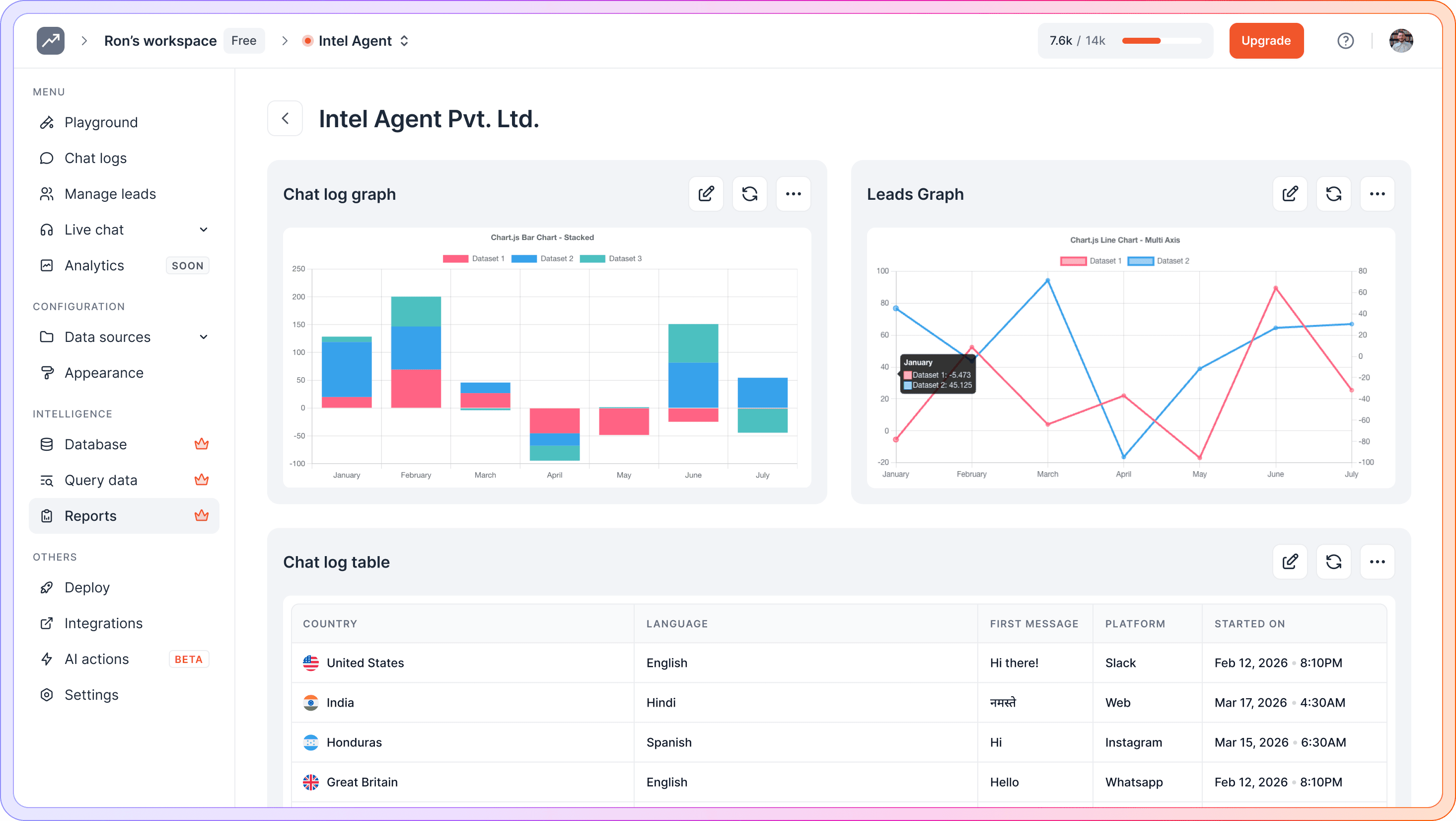 Set up your AI agent without code, connect your data sources, customize appearance, automate actions, and turn conversations into measurable insights.