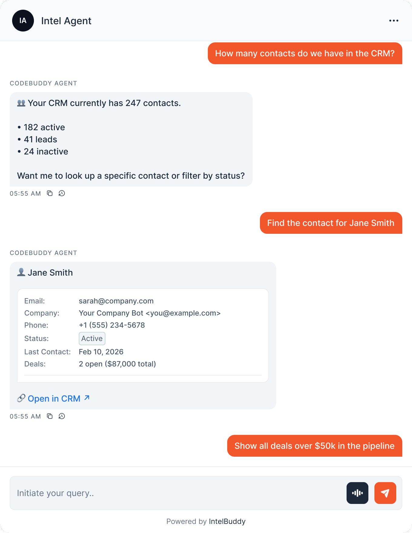 Here's how IntelBuddy interacts with a custom CRM API.