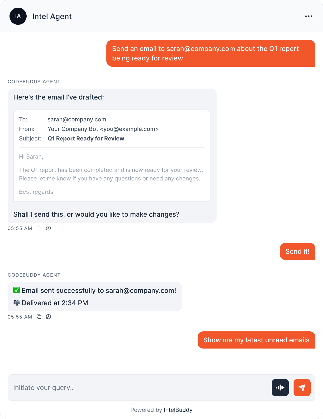 Here's what you can say to your IntelBuddy chatbot now that Email is connected.