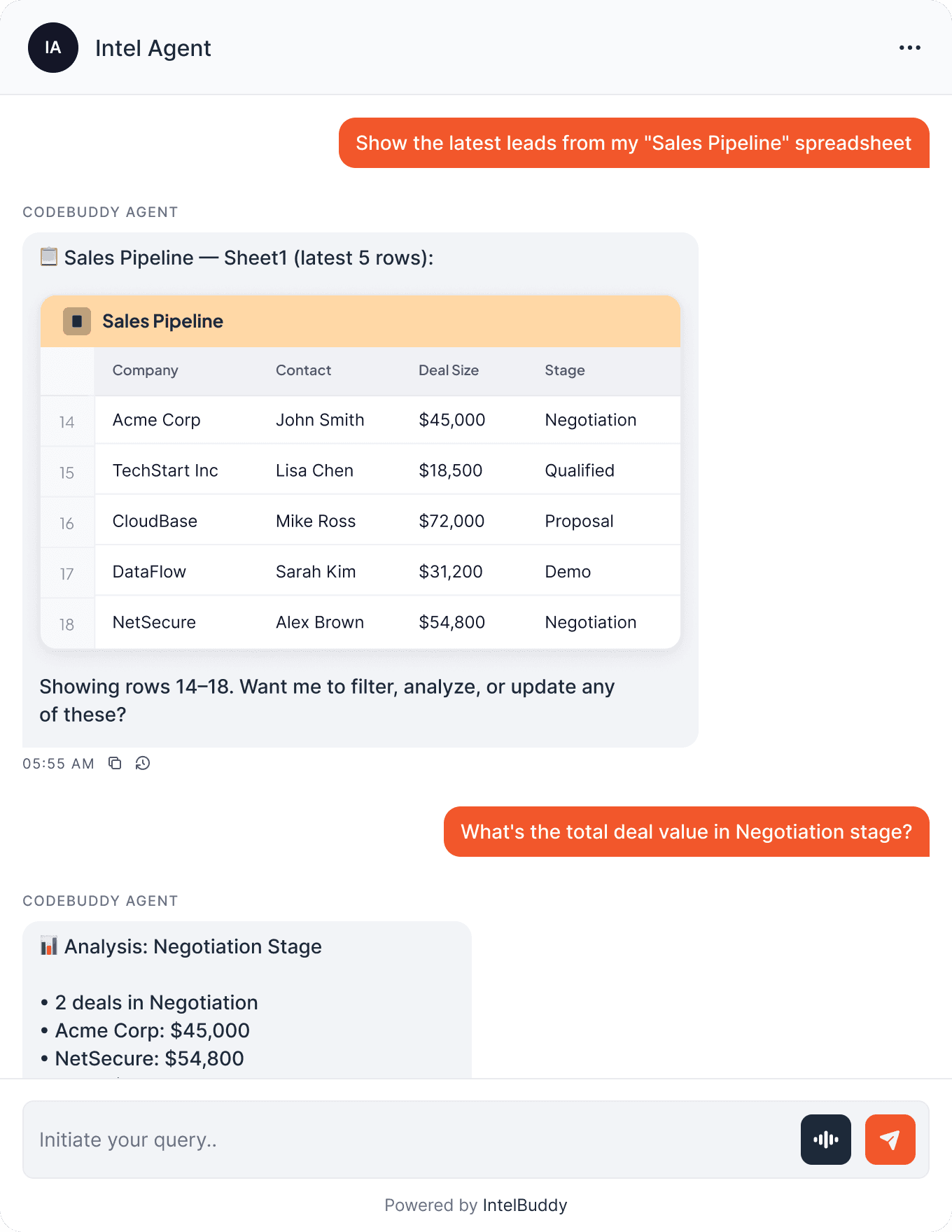 Here's what you can say to IntelBuddy now that Google Sheets is connected.