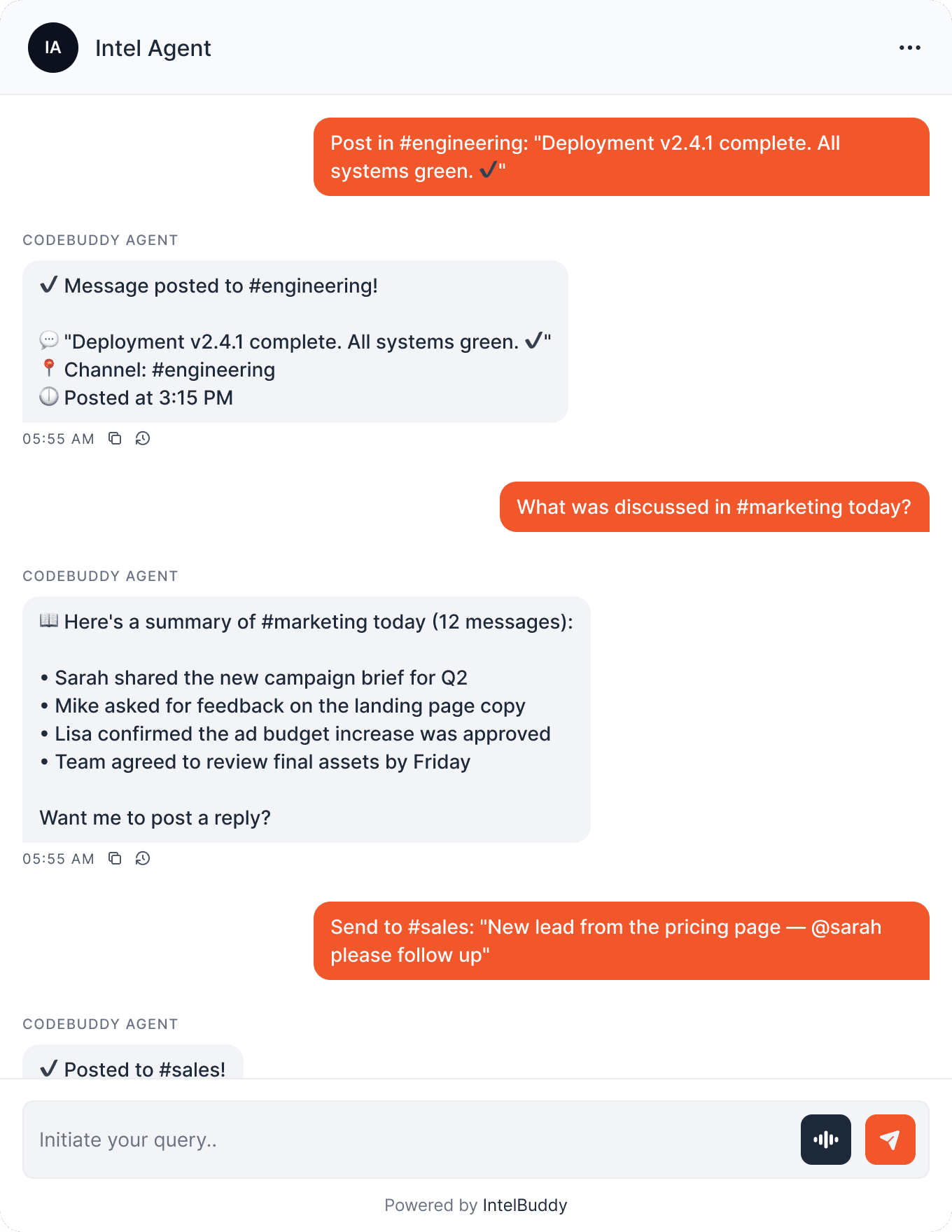 Your IntelBuddy chatbot can now post messages and read history from Slack channels.