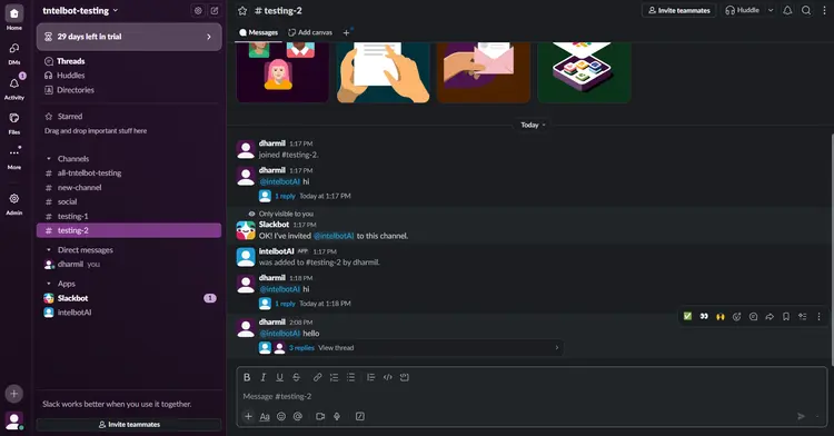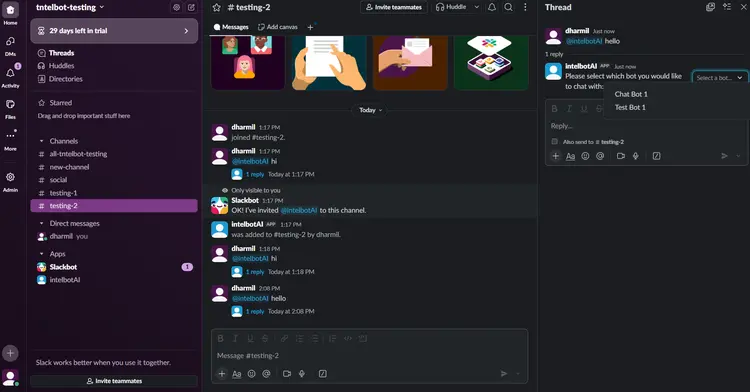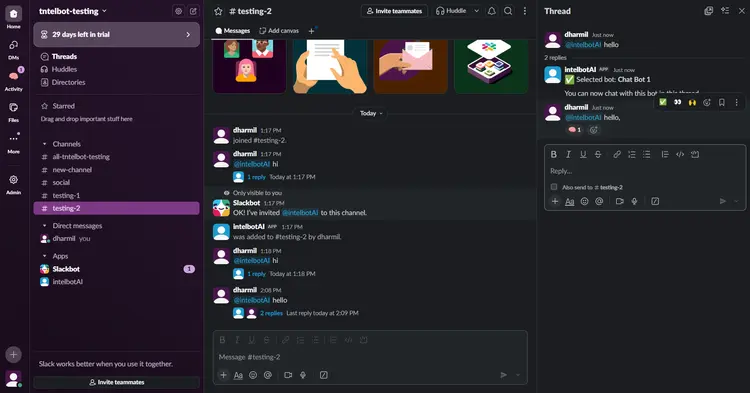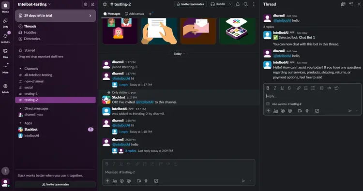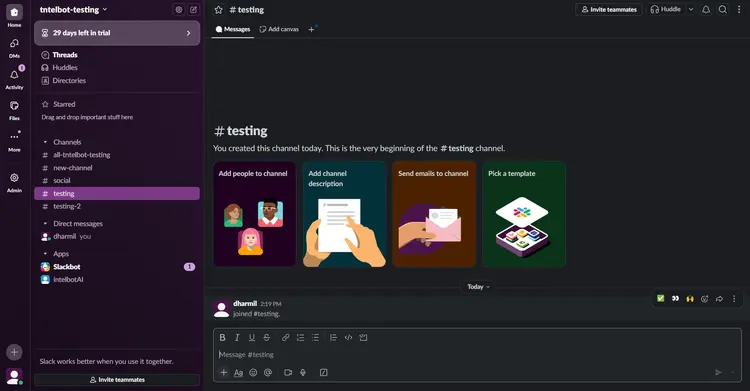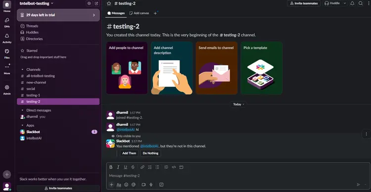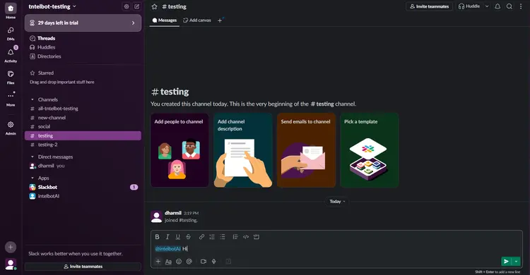 Chatbot is now configured and ready to use; start by sending a direct message or messaging in the channel