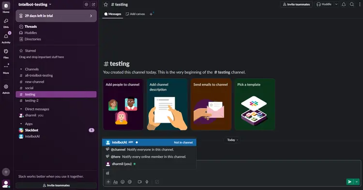Start a conversation by mentioning the chatbot in the channel. Click on @Intelbuddy to interact