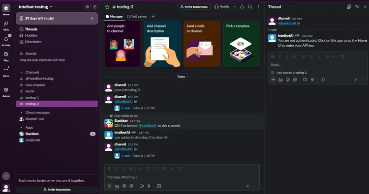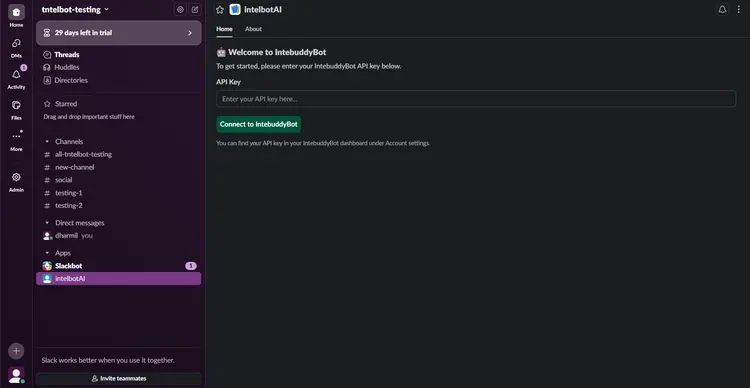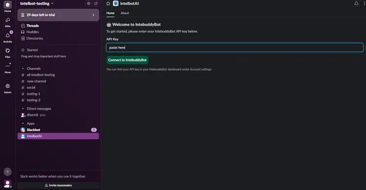 Go back to slack workspace Paste the API Key in Slack to connect Intelbuddy