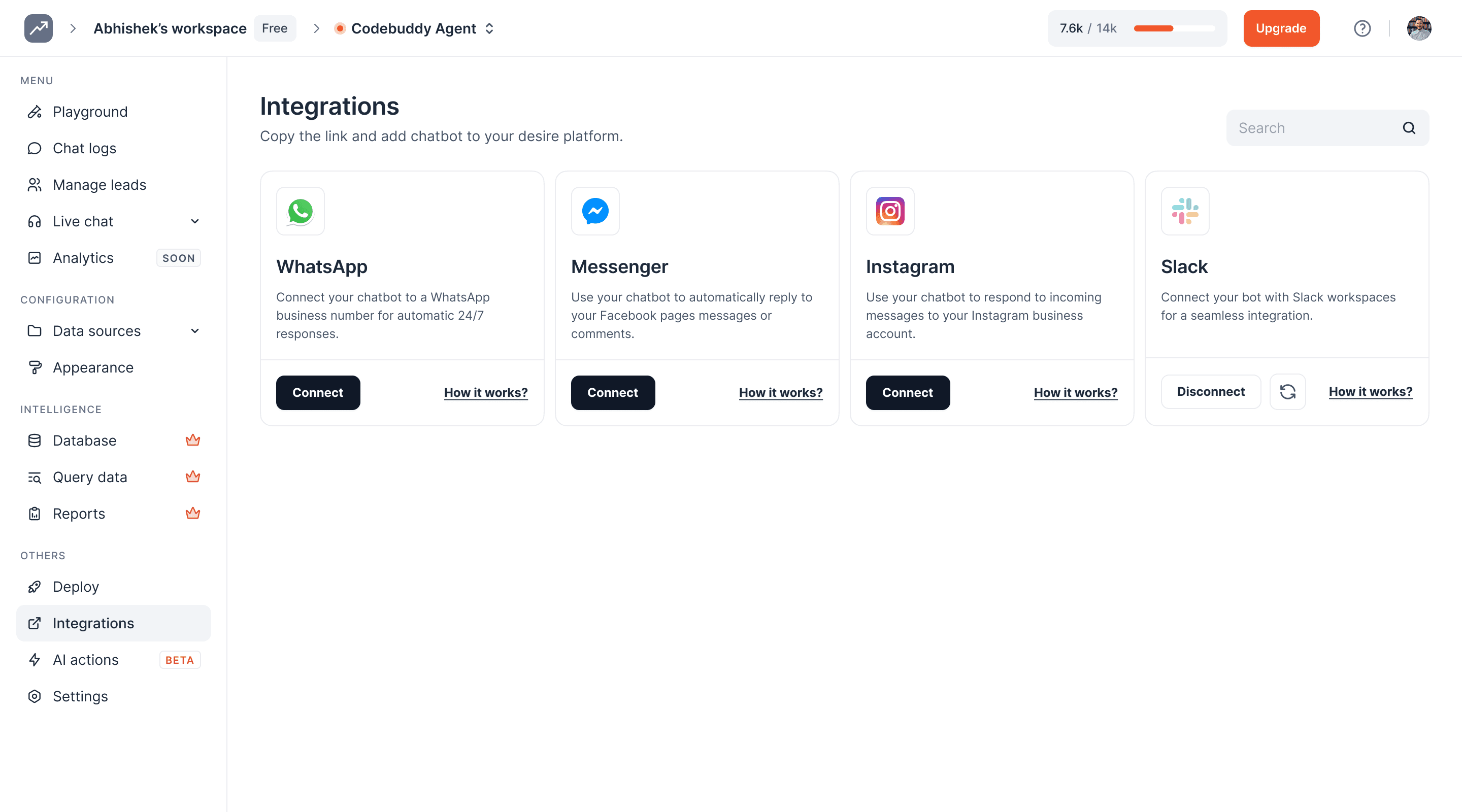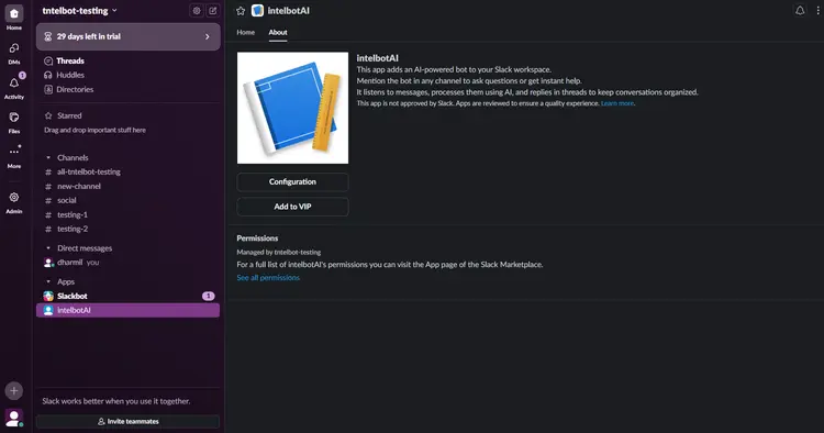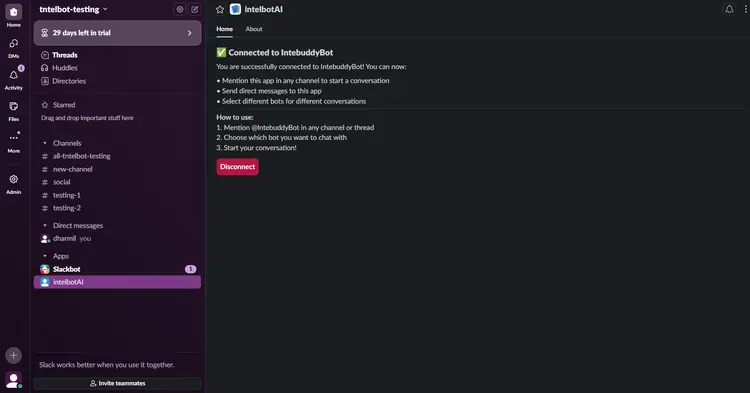 To remove Intelbuddy from Slack, open its profile and click on the Disconnect button