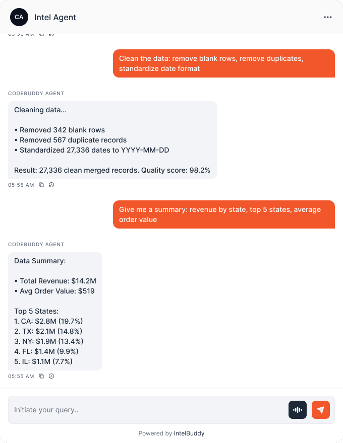 Tell AI what you need. Data transformed, merged, cleaned instantly. No writing scripts.