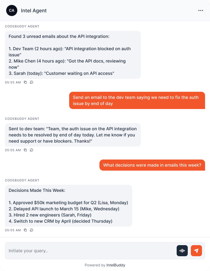 Ask about emails from specific people, topics, or dates. The AI searches and summarizes instantly.