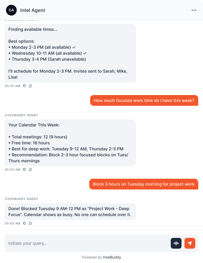 No more scheduling headaches. No back-and-forth emails. Just ask your AI assistant what you need, and it books meetings, finds time, sends invites—everything right in your chat.