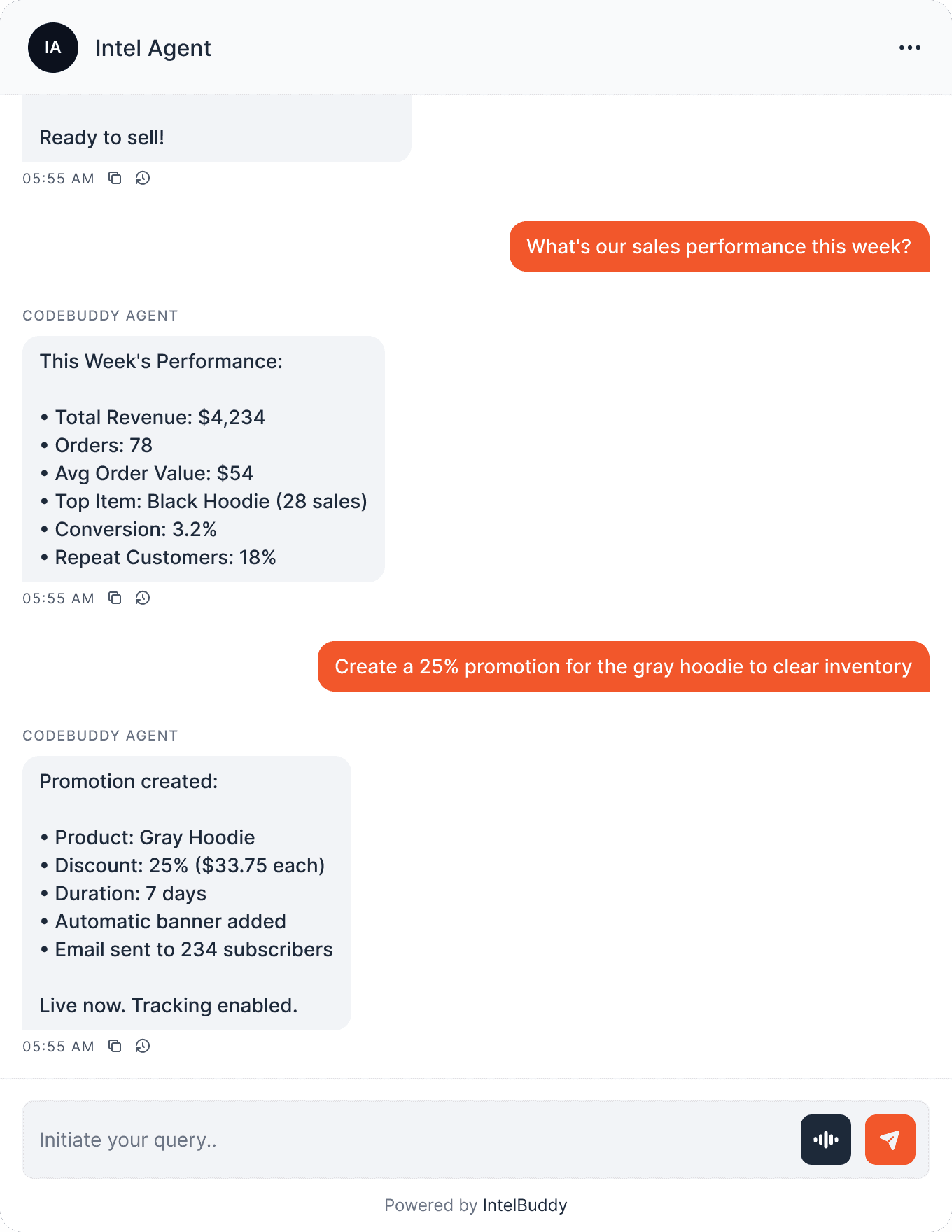 AI:Email sent to 342 jacket customers. 20% promotion announced. Open rate tracking enabled. 78 clicks in 1 hour.