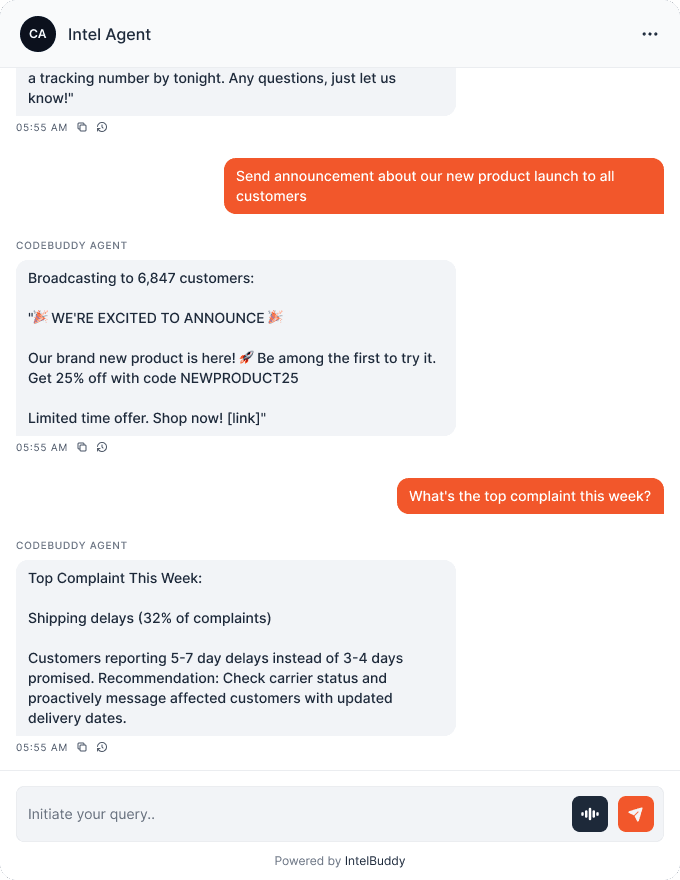 Tell the AI what to send to any customer. It composes and sends immediately—no delays, no manual work.