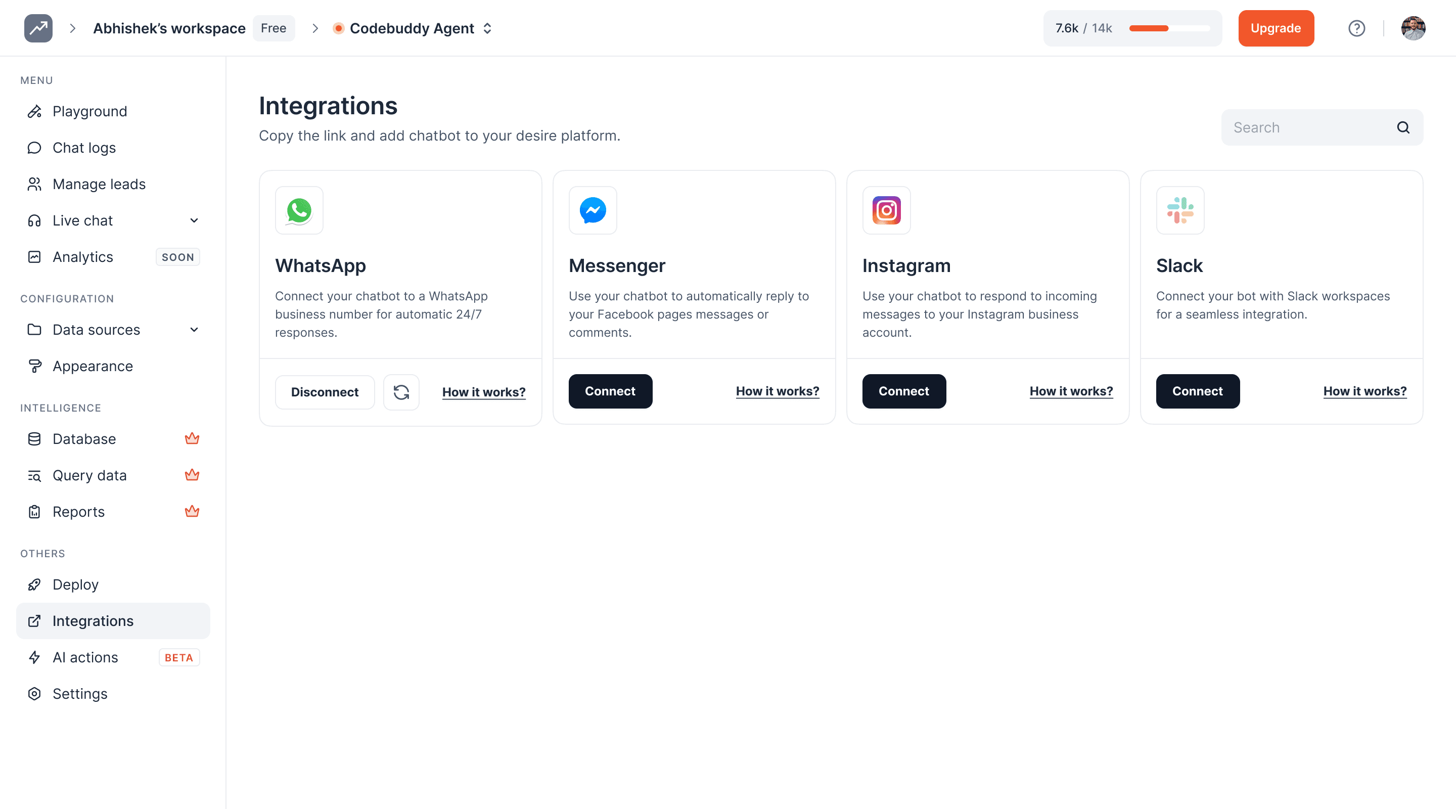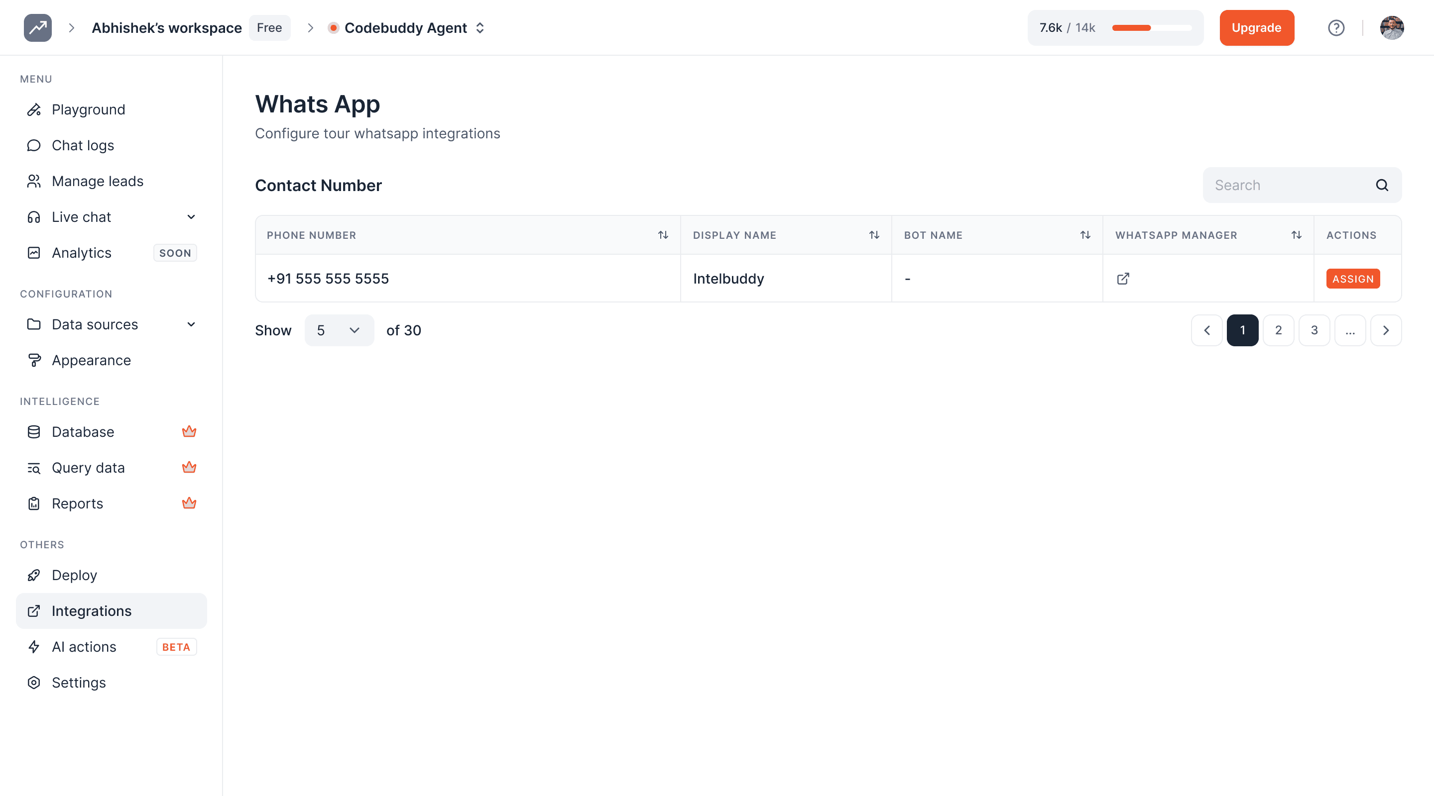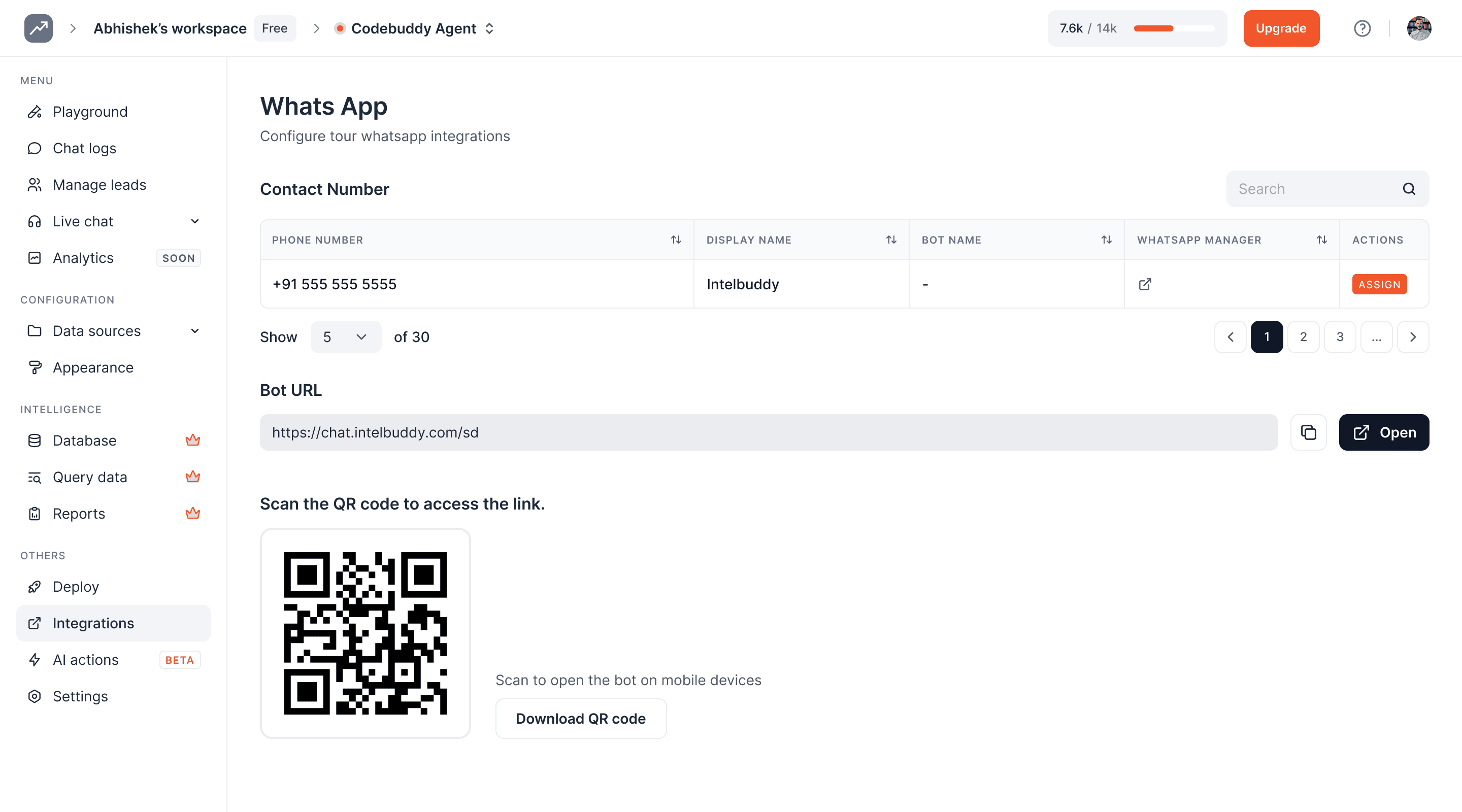 On this page, you can see the details of the WhatsApp integration, including phone number and chatbot display name