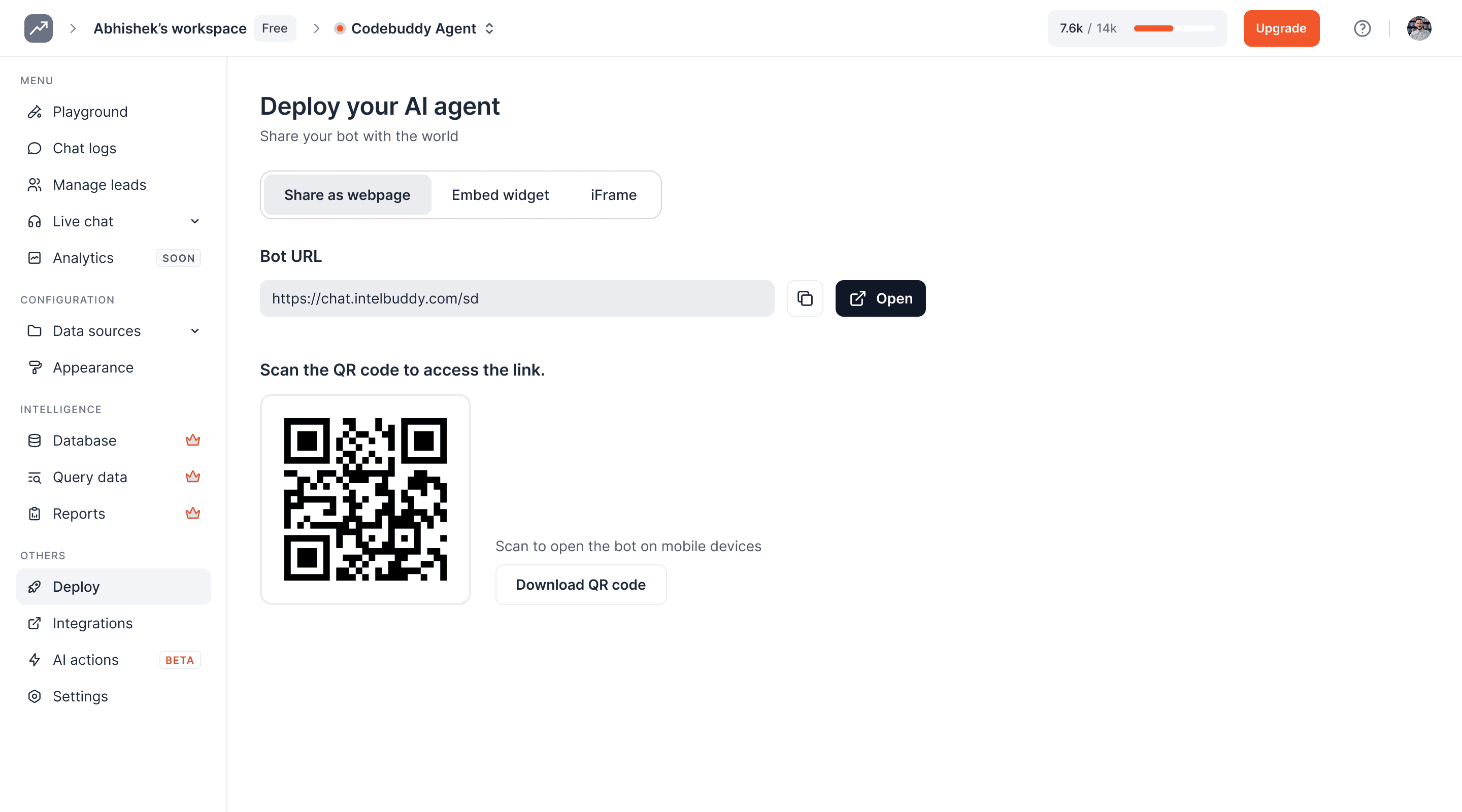 Once configured, share your WhatsApp account by downloading the QR code or using the WhatsApp link provided